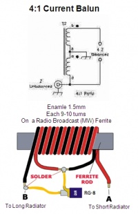 Kembali ke 4:1 balun, saya buat dari 2 utas email diameter 1.5mm yang saya lilit bersama (berdampingan) pada sebuah batang ferit bekas antenna radio MW sebanyak 10 lilit. Hot End dan Cold End kedua dipertemukan untuk disambungkan ke ground coax, sementara ujung yang lain bertemu dengan inner coax dan radiator antenna, silakan lihat ilustrasi gambar.