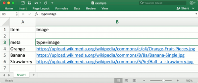 Image dapat di import menggunakan widget Import Images atau sebagai path ke image di sebuah file spreadsheet. Dalam hal ini, kolom dengan path image perlu menggunakan three-row header dengan label type=image pada baris ke tiga.