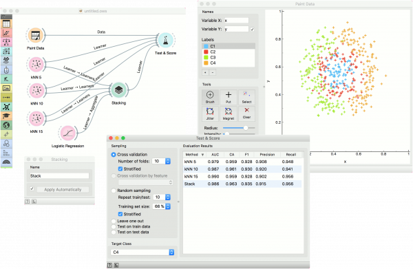 Kita akan menggunakan widget Paint Data untuk menunjukkan bagaimana widget Staking digunakan. Kita paint dataset yang kompleks dengan 4 label class dan mengirimkannya ke widget Test & Score. Kita juga menyediakan tiga learner widget kNN, masing-masing dengan parameter yang berbeda (jumlah neighbour adalah 5, 10 atau 15). Hasil evaluasi yang dihasilkan baik, tetapi bisakah kita membuatnya lebih baik?