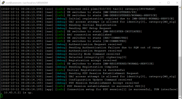[2022-10-11 08:26:13.894] [rrc] [info] Selected cell plmn [510/33] tac[1] category [SUITABLE] [2022-10-11 08:26:13.894] [nas] [info] UE switches to state [MM-DEREGISTERED/PS] [2022-10-11 08:26:13.894] [nas] [info] UE switches to state [MM-DEREGISTERED/NORMAL-SERVICE] [2022-10-11 08:26:13.894] [nas] [debug] Initial registration required due to [MM-DEREG-NORMAL-SERVICE] [2022-10-11 08:26:13.894] [nas] [debug] UAC access attempt is allowed for identity[0], category [MO_sig] [2022-10-11 08:26:13.894] [nas] [debug] Sending Initial Registration [2022-10-11 08:26:13.894] [rrc] [debug] Sending RRC Setup Request [2022-10-11 08:26:13.894] [nas] [info] UE switches to state [MM-REGISTER-INITIATED] [2022-10-11 08:26:13.895] [rrc] [info] RRC connection established [2022-10-11 08:26:13.895] [rrc] [info] UE switches to state [RRC-CONNECTED] [2022-10-11 08:26:13.895] [nas] [info] UE switches to state [CM-CONNECTED] [2022-10-11 08:26:13.907] [nas] [debug] Authentication Request received [2022-10-11 08:26:13.907] [nas] [debug] Sending Authentication Failure due to SON out of range [2022-10-11 08:26:13.912] [nas] [debug] Authentication Request received [2022-10-11 08:26:13.916] [nas] [debug] Security Mode Command received [2022-10-11 08:26:13.916] [nas] [debug] Selected integrity [2] ciphering [0] [2022-10-11 08:26:13.938] [nas] [debug] Registration accept received [2022-10-11 08:26:13.938] [nas] [info] UE switches to state [MM-REGISTERED/NORMAL-SERVICE] [2022-10-11 08:26:13.938] [nas] [debug] Sending Registration Complete [2022-10-11 08:26:13.938] [nas] [info] Initial Registration is successful [2022-10-11 08:26:13.938] [nas] [debug] Sending PDU Session Establishment Request [2022-10-11 08:26:13.938] [nas] [debug] UAC access attempt is allowed for identity[0], category [MO_sig] [2022-10-11 08:26:14.142] [nas] [debug] Configuration Update Command received [2022-10-11 08:26:14.165] [nas] [debug] PDU Session Establishment Accept received [2022-10-11 08:26:14.165] [nas] [info] PDU Session establishment is successful PSI [1] [2022-10-11 08:26:14.185] [app] [info] Connection setup for PDU session [1] is successful, TUN interface [10.45.0.2] is up.